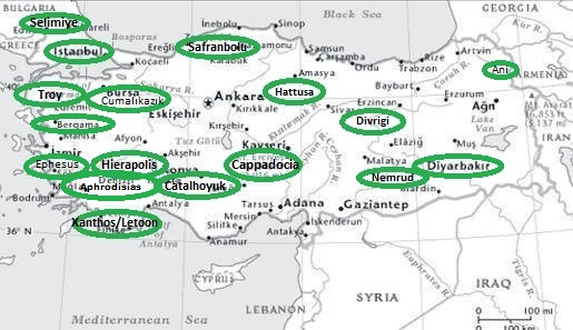 我在下面的地图上标出了土耳其一些值得参观的有趣的地方和考古遗址。
